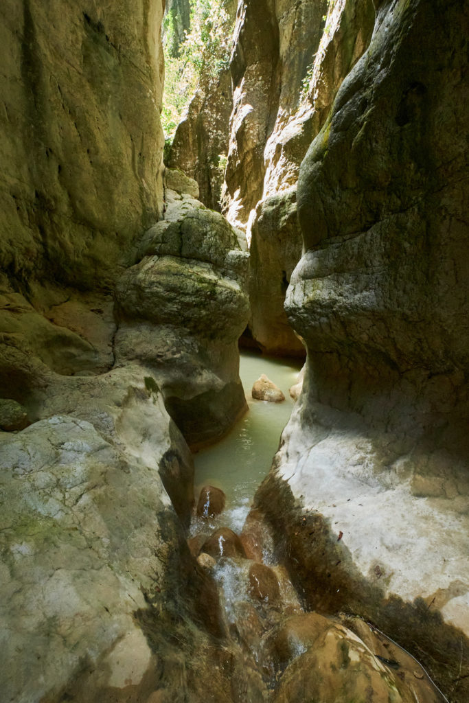 Ja al migdia amb un sol radiant desfem el camí fins l’entrada de Tolba, ens dirigim en cotxe fins a Ciscar, allà ens col·loquem en uns pocs cotxes que ens portaran a la sortida del Congost. El trajecte és breu i una mica accidentat, doncs circulem amb els cotxes un tros pel llit del riu, ple de còdols que dificulten el pas de les rodes dels turismes, poc apropiats. Ara hi entrarem des del sud i molt impacients per a remullar-nos. Ara el canvi de temperatura és nota més que al primer tram de Tolba, és sobtat, ja no fa gens de calor . El riu porta poca aigua però ben freda.