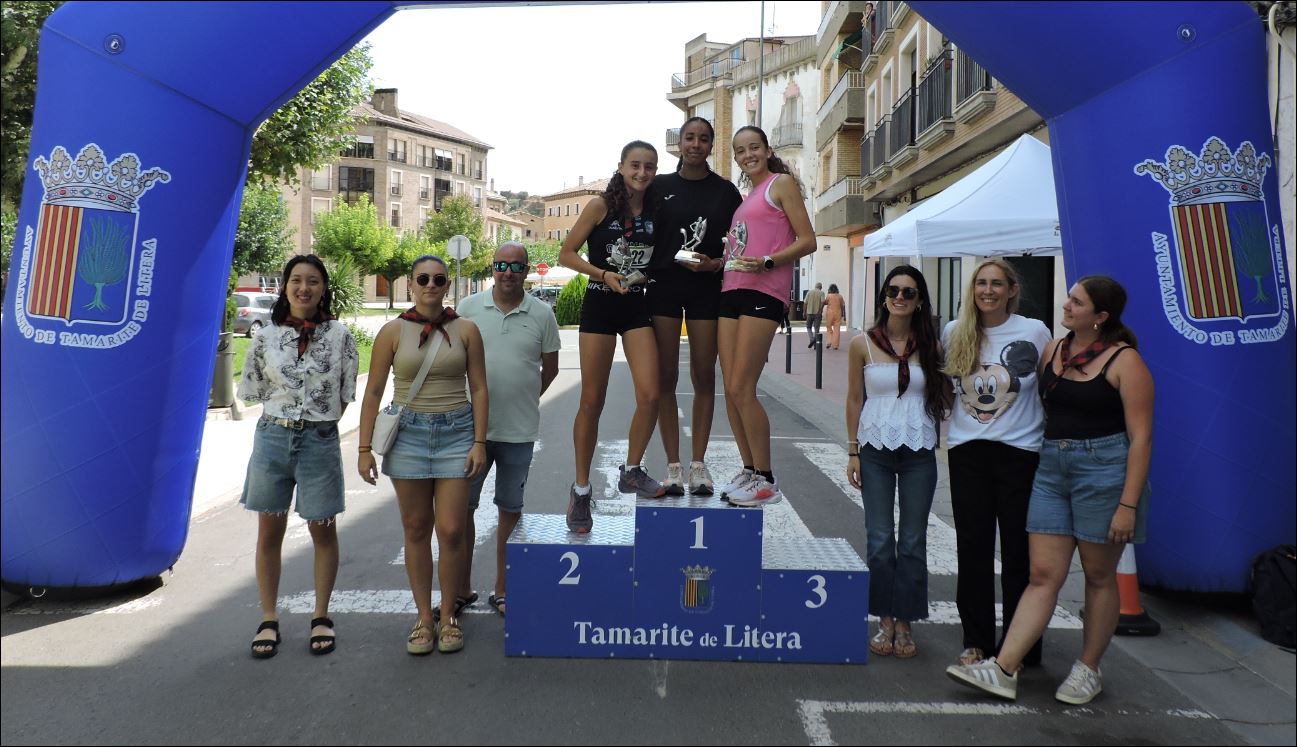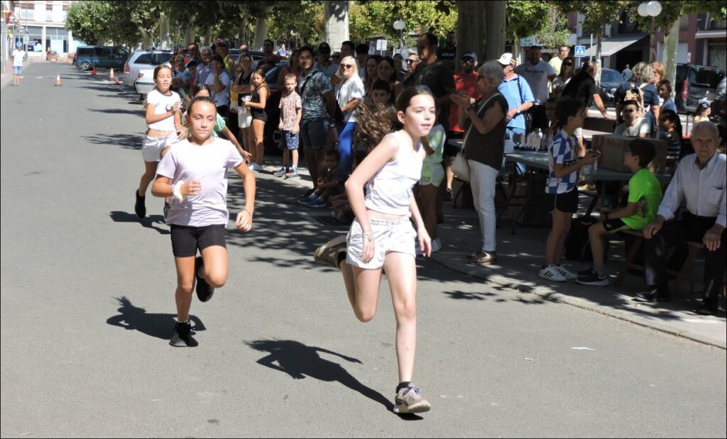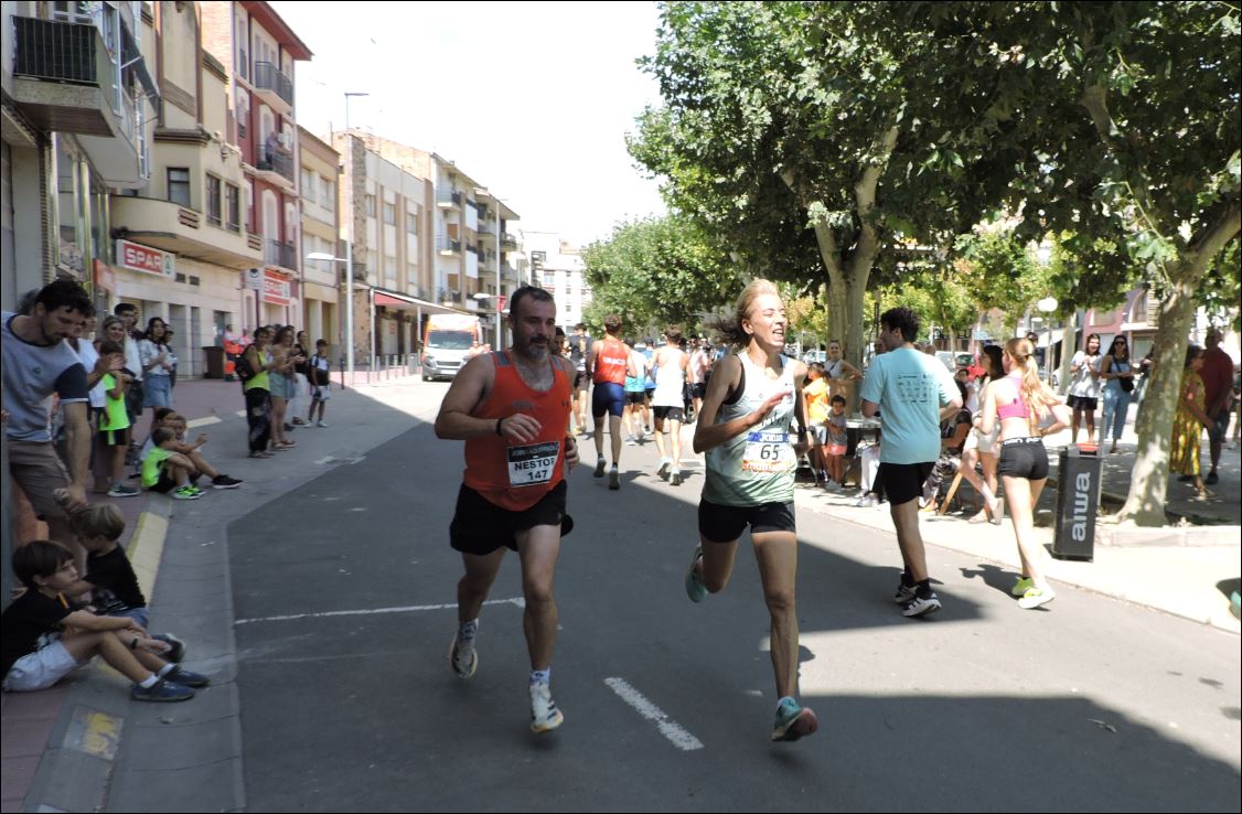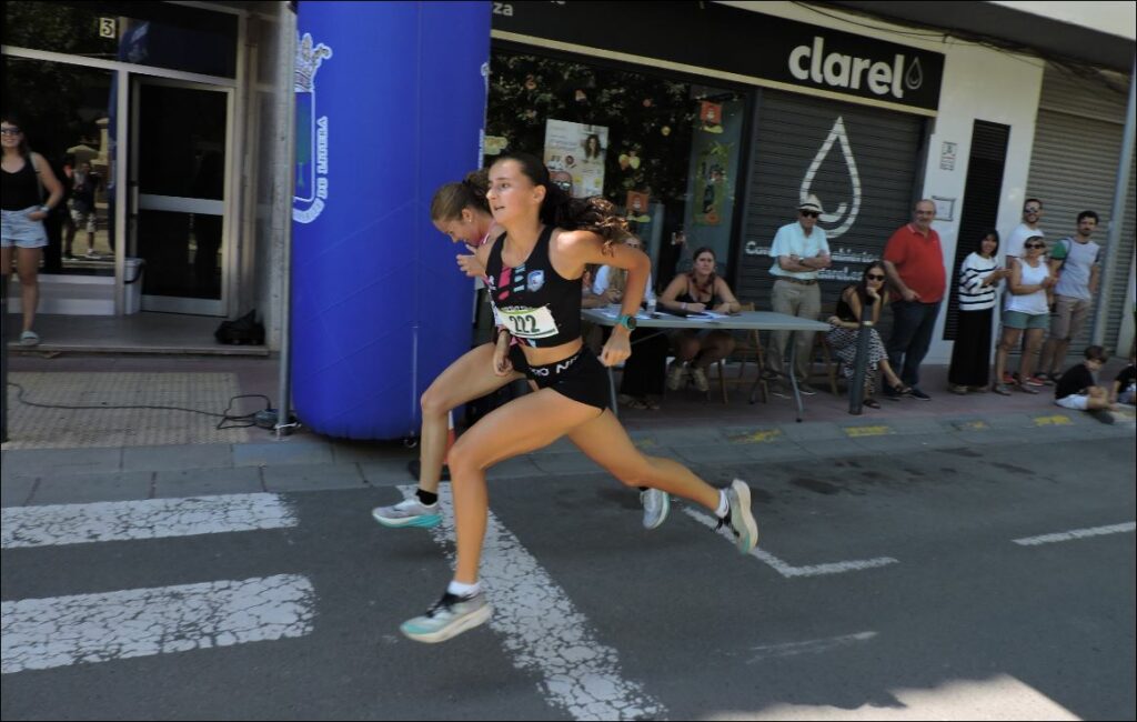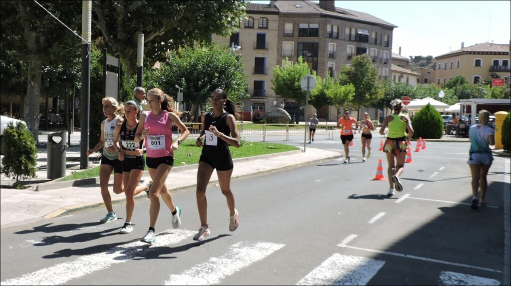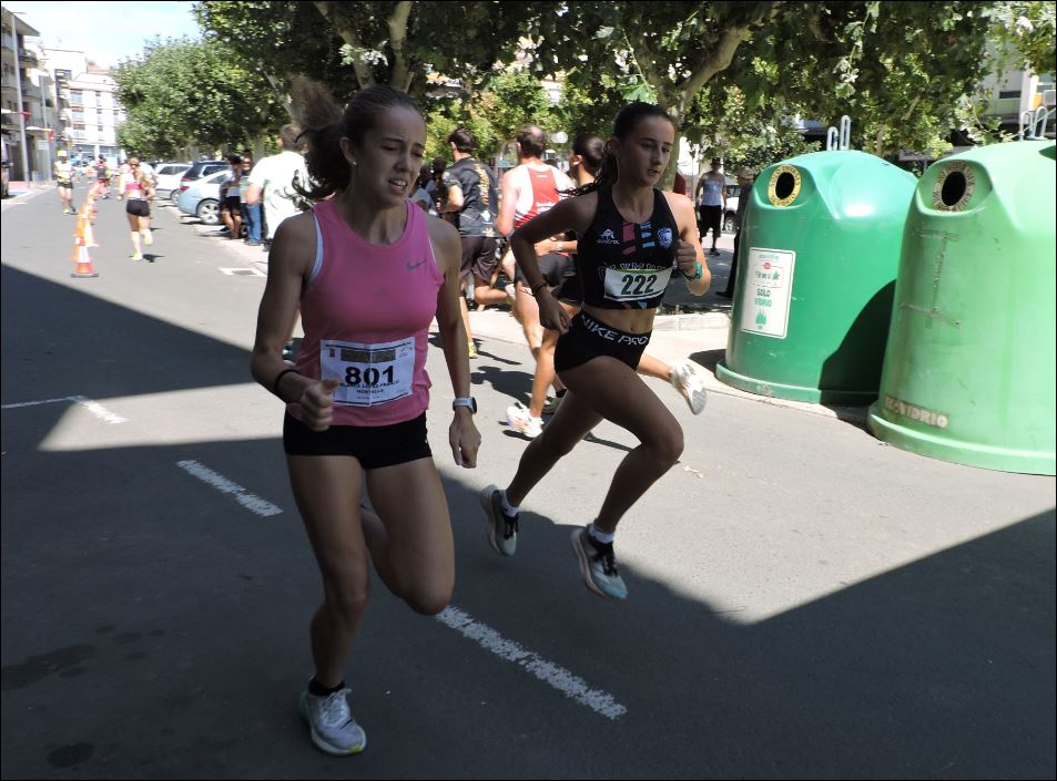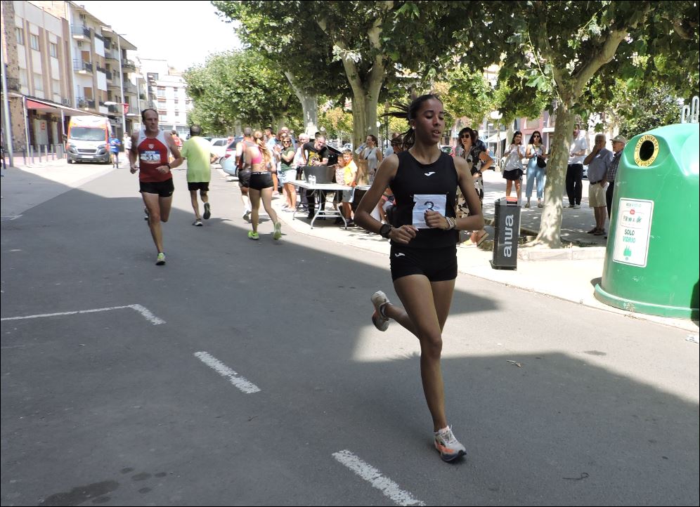 En las féminas, a partir de la segunda vuelta y tras perder la primera prima, la leridana Marwa El Kouyaali se fue de sus inmediatas perseguidoras y pasó inadvertida para el público hasta su entrada en meta. Practica el mismo estilo soso de carrera que suele realizar Castells cuando se siente superior a sus rivales. Las zaragozanas María Zabaleta y Blanca López efectuaron toda la carrera juntas, disputando primas, y, al final, se impuso la joven Zabaleta, que no hace mucho se colocaba la medalla de plata en el campeonato de España de 1.500 m. Sub16. Ella también había ganado la primera prima a Marwa, actual campeona de España de 5.000 m. Sub20, que recientemente ha estado participando en el campeonato de Europa. La veterana Laura Rosell se adjudicó el cuarto premio. Y, entre las locales, Celia Rodríguez ganó a su compañera de categoría, Mª José Cortés, que mostraba su ilusión por correr y con el deseo de que otras mujeres se incorporasen a la carrera en ediciones posteriores, aunque terminó muy agotada.