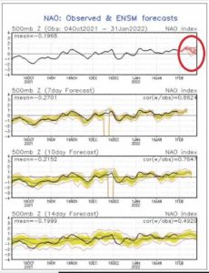 ▶¿Pero que nos depara el mes de febrero? Pues, muy a pesar, los modelos a medio plazo, continúan marcando un tiempo seco o muy seco, sin apenas señales de precipitaciones. Esta es la tendencia que se observa en sendos modelos meteorológicos en lo que respecta a los próximos 15 días. También lo confirma el índice NAO (La Oscilación del Atlántico Norte (NAO) es el modo dominante de la variabilidad del clima invernal en la región del Atlántico Norte. La NAO es una oscilación de la masa atmosférica entre la alta subtropical y la baja polar. Su estado condiciona en gran parte la variabilidad invernal de muchas regiones, en especial de Europa del Norte. La fase de la NAO viene dada por el signo del índice de la NAO, de modo que un índice NAO + acostumbra a ser un indicativo de una reducción de la precipitación invernal). Véase gráficos NAO adjuntados.