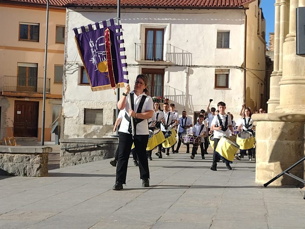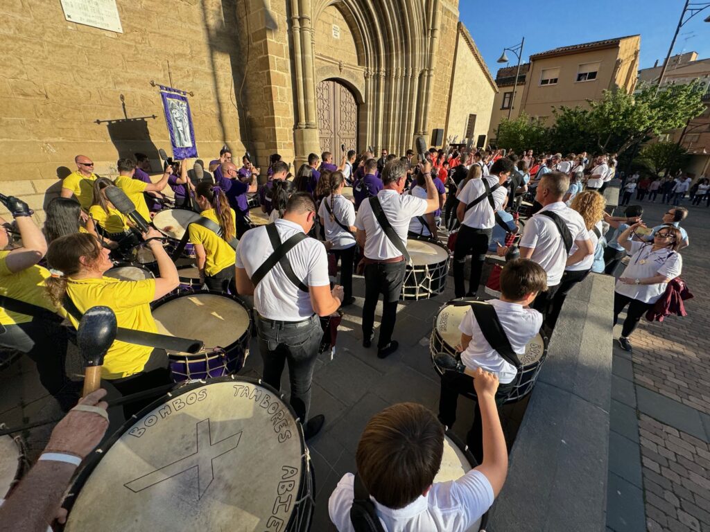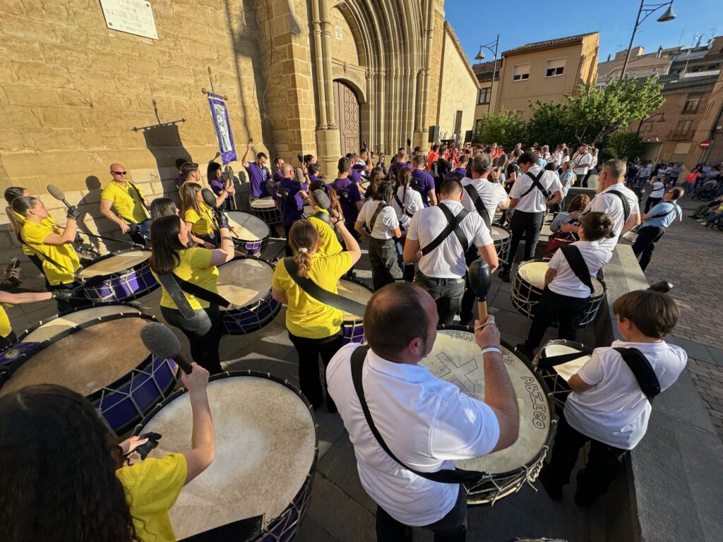 El encuentro fue seguido por numerosos vecinos y visitantes y también por la alcaldesa Patricia Rivera y la concejal de Cultura, Beatriz Oliván, que recibieron a su vez el obsequio de la Asociación de Bombos y Tambores de Binéfar.