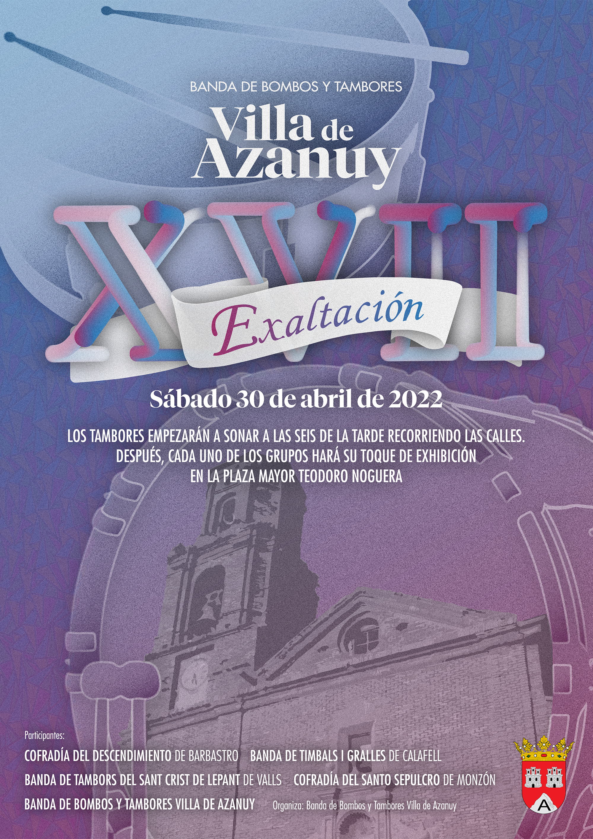 A partir de las 18 horas la Plaza Teodoro Noguera de Azanuy irá recibiendo las diferentes bandas participantes que saldrán desde diversos puntos de la población haciendo resonar sus toques por todos los rincones. Está confirmada la presencia de la Cofradía del Descendimiento de Barbastro, la Banda de Timbals i Gralles de Calafell, la Cofradía del Santo Sepulcro de Monzón y la Banda de Tambors del Sant Crist de Lepant de Valls, además de la banda local. Una vez en la plaza cada formación realizará su exhibición y después todas llevarán a cabo un toque conjunto. Como es habitual, las bandas participantes recibirán un recuerdo conmemorativo del encuentro.