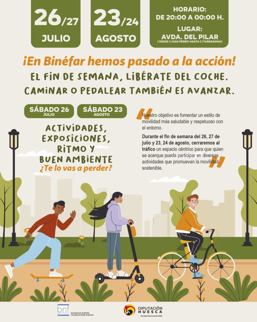 La actividad, denominada ‘¡El fin de semana, libérate del coche! En Binéfar, hemos pasado a la acción’ cuenta con financiación del 80% de la Diputación Provincial de Huesca. Y culminará el 23 de agosto con una jornada de concienciación.