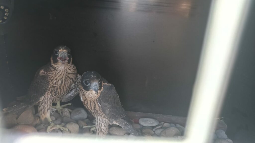 El Ayuntamiento de Binéfar se ha adherido a la red de municipios con halcones urbanos como medida para controlar el aumento del censo de palomas en la ciudad. Desde hace una semana, lleva instalada una caja nido en la azotea del Ayuntamiento, donde se están criando dos halcones peregrinos de la subespecie brookei presente de forma natural en la Península Ibérica, con el método hacking (alimentación de pollos de halcón hasta que comienzan a volar), para favorecer su asentamiento en la zona.
