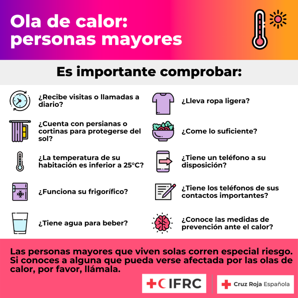 Cada año, durante los meses del verano, Cruz Roja desarrolla la campaña de información y sensibilización para la promoción de hábitos saludables básicos (relacionados con la alimentación, la hidratación, la exposición al sol, entre otros) que contribuyen a evitar o reducir el impacto negativo de las altas temperaturas en nuestro organismo. La campaña se dirige a la población general y, especialmente, a aquella más vulnerables a las temperaturas elevadas.