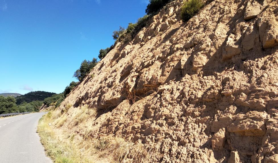 Llegando al cruce de cuatro caminos, nos desviamos hacia el que comunica con la carretera HU-V-9302 y a los pocos metros hicimos otra parada, donde pudimos observar unos afloramientos de materiales detríticos que pertenecen al Oligoceno. Se trata de afloramientos de areniscas, arcillas y conglomerados poligenétocos y polimétricos. En su mayor parte, estos materiales pertenecen a los niveles de calcolutites ocres y areniscas de la «Formación Peralta» y los niveles detríticos de los llamados «Conglomerados de Baells».