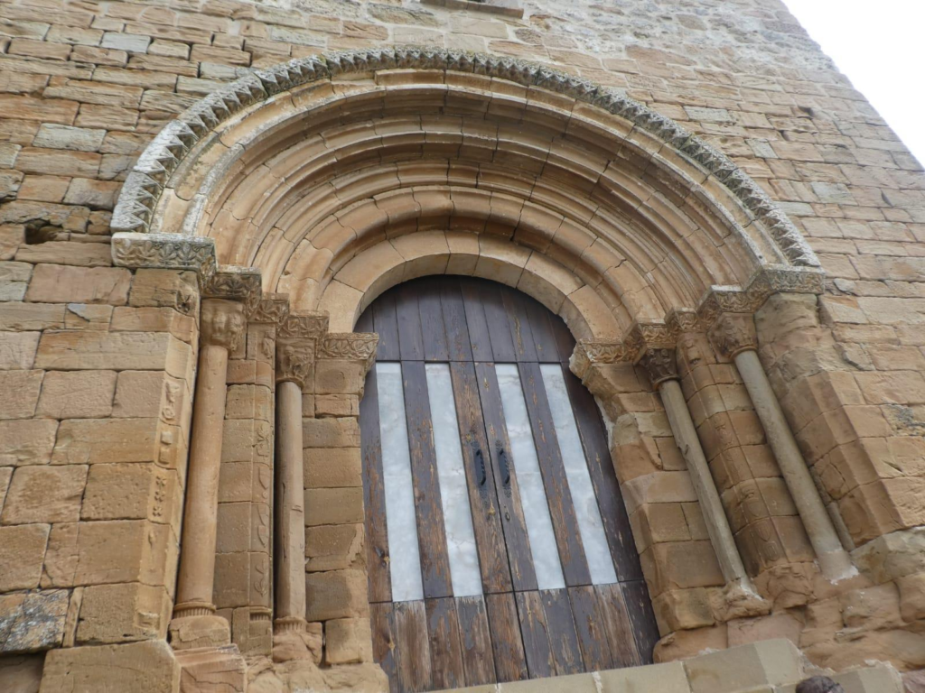 Consta de cinco arquivoltas en degradación, que le otorgan un aspecto claramente abocinado. Se decoran con bezantes y escocias alternativamente en sucesión de resaltes y acanaladuras. Apean por medio de ábaco corrido bellamente decorado con motivos vegetales de hoja de higuera- en tres jambas rectas en las que se intercalan sendas parejas de capiteles con sus columnillas monolíticas. También nos comentó los pormenores de la situación del importante sarcófago de Nachá del siglo XIV.