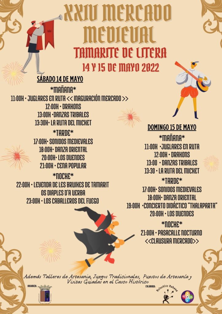 El Mercado Medieval, ofrece entre las 11.00 h del sábado 14 y las 21.00 h del domingo 15 de mayo una serie de actividades que se irán sucediendo a lo largo de los dos días que incluyen juglares, danzas de distinta índole, la ruta del michet –denominación del vermú en Tamarite-, música, duendes, los caballeros del fuego y un pasacalle para clausurar el mercado. Además, desde el área de Turismo y Patrimonio se realizarán visitas guiadas al casco histórico que requerirán inscripción previa en el Ayuntamiento de Tamarite de Litera.