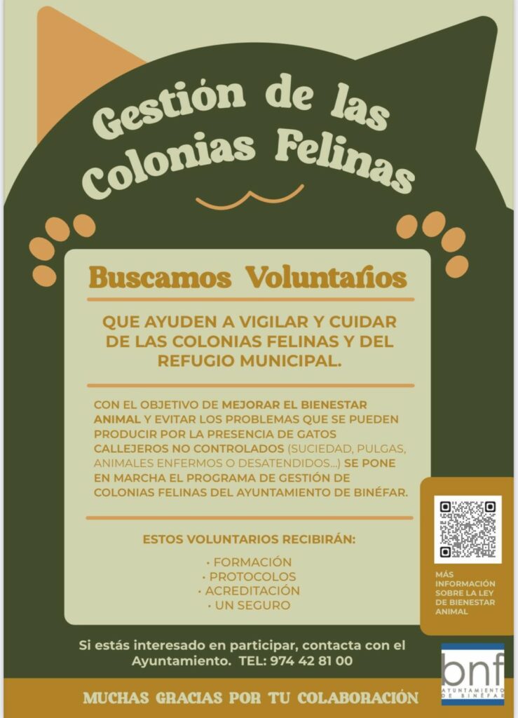 La Concejalía de Medio Ambiente del Ayuntamiento de Binéfar ha puesto en marcha una campaña para el control de la población de gatos callejeros, conforme a las obligaciones municipales con respecto a la Ley 7/2023 de Bienestar Animal, y con la que se pretende favorecer la convivencia y evitar la proliferación descontrolada de felinos, dado que su exceso conlleva problemas de salud pública, acumulación de suciedad, sufrimiento animal, atropellos, etc.