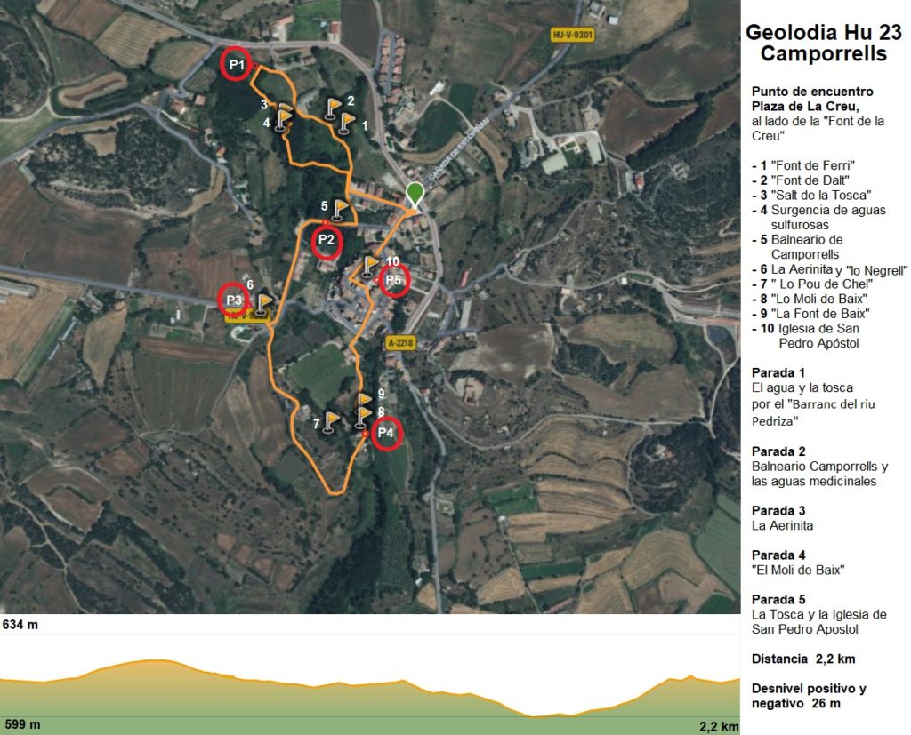 El recorrido geológico es de unos 3 Km por los alrededores de la población. Se establecerán siete grupos en diferentes franjas horarias, comenzando a las 9:30 h. El número máximo de participantes, para cada franja, será el de 30 personas acompañadas de dos guías durante todo el recorrido y haciendo 5 paradas donde unos geólogos les explicarán varios aspectos de la geología de la zona. El lugar de encuentro, para los diferentes grupos, serán en la Plaza de la Creu, donde se pasará lista de los apuntados en cada turno. En la hoja de inscripción, ya se indican los horarios de cada uno de los grupos. Mañana 9:30, 10:15, 11:00, 11:45 ,12:30 horas Tarde 16:30, 17:15 horas.