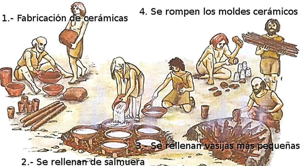 En estos recipientes, se iba precipitando la sal hasta casi se llenarse de un molde compacto de sal, también llamado “pan de sal”. Una vez evaporada toda el agua se sacaba del fuego y se rompía el vaso para extraer el “pan de sal” o la “Briqueta” (termino que proviene del francés “brique” que significa ladrillo. Por ello se llama sistema de briquetas o briquetaje. De ahí la gran cantidad de trozos de cerámica alrededor del cocedero. Por lo tanto, dichos vasos eran de un solo uso, de ahí que fueran elaborados con pastas groseras y acabado poco cuidado.