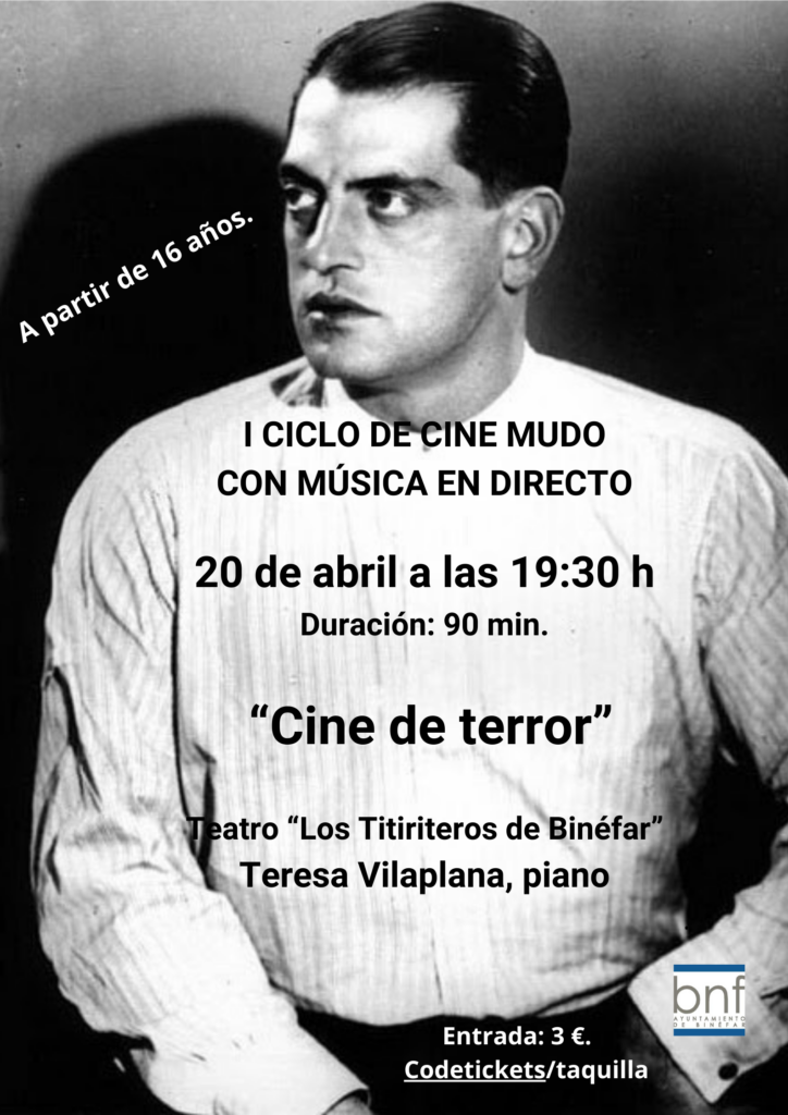 Este mes también regresa una nueva actuación, la cuarta, del I Ciclo de Cine Mudo con Música en Directo a cargo de la pianista binefarense Teresa Vilaplana. La próxima sesión será el sábado 20 y estará dedicada al ‘Cine de terror’. La función será en el Teatro Municipal ‘Los Titiriteros de Binéfar’ a partir de las 19.30 (edad recomendada partir de los 16 años).