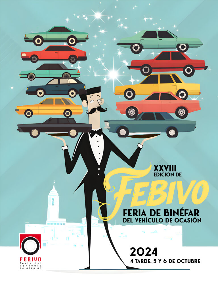 El cartel de FEBIVO 2024 está realizado con la técnica de ilustración digital con una estética basada en la década de los años 1950. El personaje principal es un camarero con muy buena presencia que sujeta en ambas manos bandejas sobre las que descansan un gran número de vehículos de ocasión. El mensaje a transmitir es que en FEBIVO te sirven en bandeja una multitud de coches de los que podrás elegir el que más te guste. Finalmente, al fondo de la ilustración aparece un perfil del municipio de Binéfar para que quede reflejada la población en la que se realizará el evento.