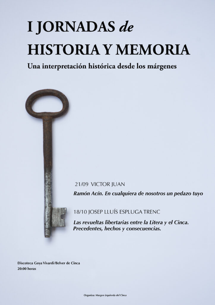 Estas primeras jornadas aspiran a corregir esas asincronías, buscando la porosidad entre la historia y la memoria y priorizando la importancia de las personas que destacaron en el pasado reciente en la defensa de unos planteamientos ideológicos que han sido menospreciados en la construcción de ese relato histórico normativo. En esta primera edición se centran en el movimiento libertario en la irrenunciable convicción de que, igual que el viejo de Hemingway, un hombre o un pensamiento pueden ser destruidos, pero no derrotados. Por estas razones el eje vertebrador será el río Cinca, antes como territorio común y nexo de acción que, como línea impermeable de investigación, con toda la flexibilidad necesaria para construir un ámbito de estudio sin apriorismos ni dogmas.
