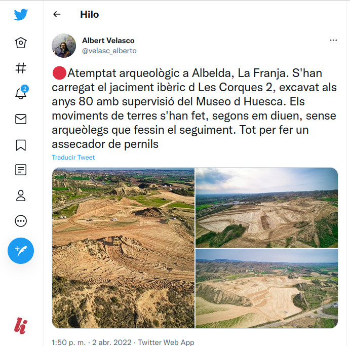 Un tweet de Albert Velasco, profesor en el departamento de Història de l’Art en la UDL (Universitat de Lleida) i professor de Legislació i Tutela del Patrimoni Artístic, título que le acredita para hablar con propiedad, ha sido el detonante respecto a la advertida destrucción de un yacimiento arqueológico en el desmonte para la construcción del secadero de jamones que está construyendo Litera Meat en Albelda.
