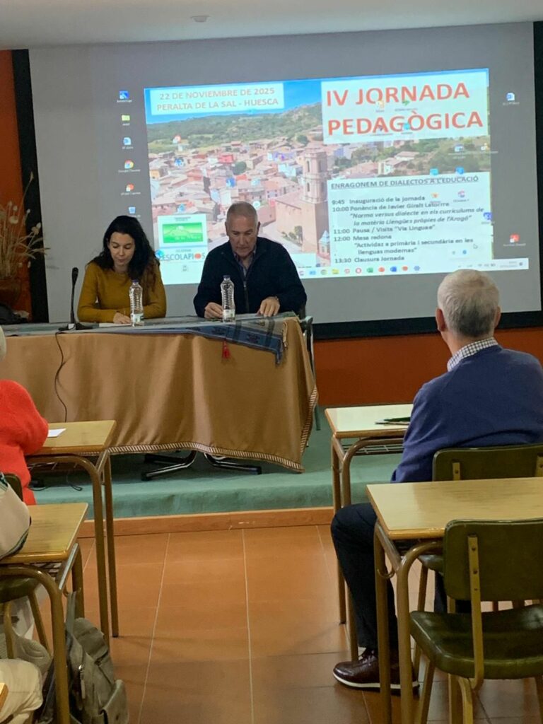 Abrió la jornada, Javier Giralt (profesor de filología catalana en la universidad de Zaragoza, presidente de la Academia Aragonesa de la lengua, y director del Instituto Aragonés del Catalán) con una ponencia sobre » Norma versus dialecte en el curriculums de de la materia Llengues propies d’Aragó».