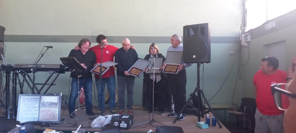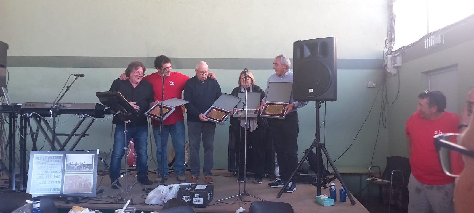 Y llegó el momento más esperado de la tarde: el homenaje a los “Jóvenes Pop”, un grupo de música compuesto por cuatro vecinos de la localidad y que actuó entre los años 1966 y 1975. Los homenajeados fueron: José Marco Escuder “Cheleta”, José Marco Rivas “Joseret”, José María Gil Villacampa “Gilet” y Pablo Arenillas Viu “Pablito”. Los tres primeros estuvieron presentes en el acto mientras que el cuarto no pudo desplazarse y fue representado por su hermana Consuelo Arenillas.