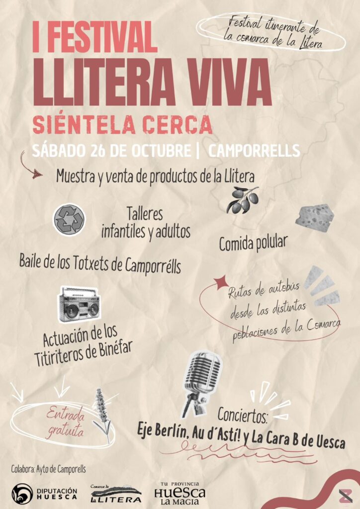 La Comarca de La Litera / La Llitera se prepara para acoger el I Festival Llitera Viva, un evento anual que nace con el propósito de poner en valor la riqueza cultural, turística y gastronómica de la comarca. Bajo el lema «Siéntela cerca», este festival será itinerante y se celebrará cada año en una localidad diferente de la comarca. La primera edición tendrá lugar el próximo sábado 26 de octubre en Camporrélls, un municipio de la Litera Alta con poco más de 100 habitantes.