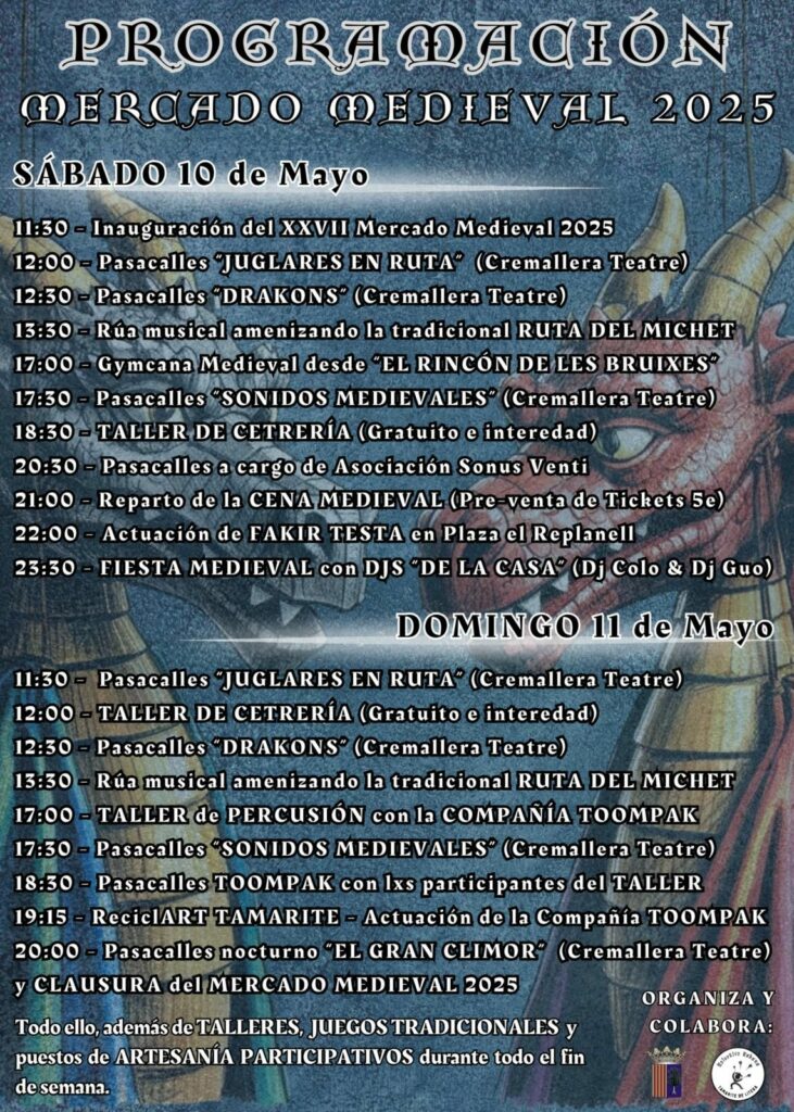 El mercado medieval arrancará el sábado con muchas actividades, donde se volverá a disfrutar del rincón de las brujas en una nueva ubicación y desde donde saldrá una yincana para los más pequeños con la que se pretende “dinamizar diferentes puntos del municipio por los alrededores del mercado”, recalcó Ana Ferrer, del Kolectivo Kabana. La noche concluirá con una cena con precios populares cuyos tickets podrán adquirirse desde el 28 de abril al 6 de mayo en la librería Claralión.