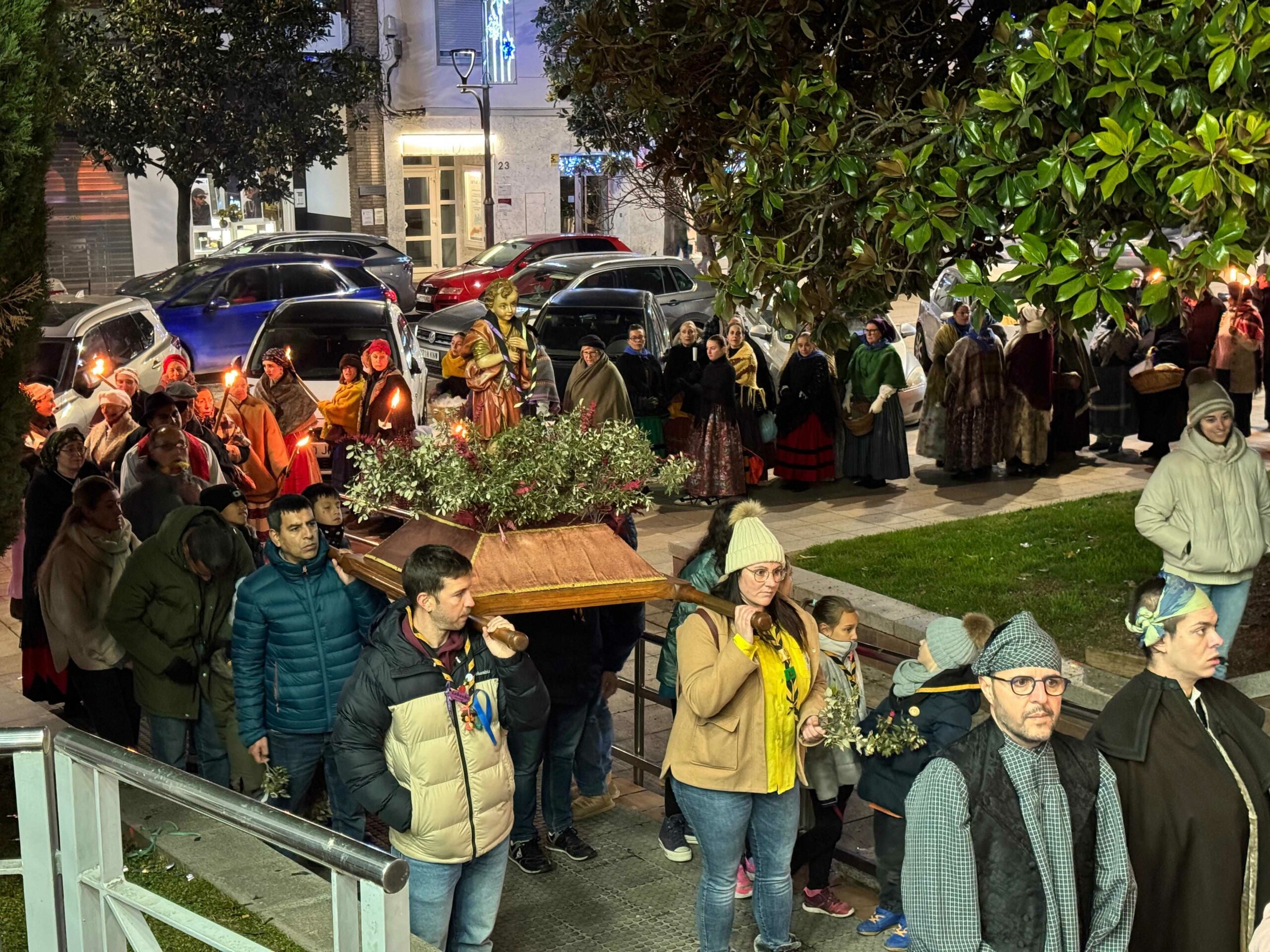 La celebración de la fiesta de invierno ha comenzado al mediodía con la misa baturra de San Quílez en la iglesia parroquial de San Pedro Apóstol. Pero el evento más popular ha tenido lugar en torno a las 18.30 con la procesión de la talla del santo desde la plaza de San Quílez a la plaza España, previa a la oración. La carreta que portaban los mozos con leñas y ramas de encina, símbolo de esta celebración, ha abierto la comitiva de la que formaban parte antorcheros, tambores y decenas de fieles ataviados con ropajes tradicionales, entre ellos la alcaldesa Patricia Rivera y el concejal de Actos Populares y Festejos, César Pardos. A ellos se ha sumado la concejal de Cultura y Juventud, Beatriz de Pano.