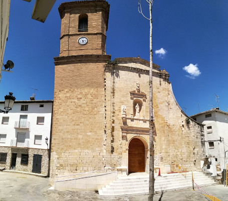 Entramos a Camporrells por la calle de la Rueda adentrándonos en el casco medieval en dirección a la Plaza de la Iglesia, cuyo magnífico templo fue construida casi por completo (salvo la parte alta del campanario) con sillares de tosca o travertino que además de belleza le confieren una perfecta sonoridad. Dedicada a San Pedro Apóstol, consta de tres naves y fue reedificado al lado de otro templo románico en 1768.