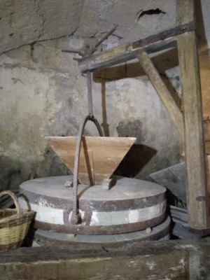 Nos desviamos a la izquierda hacia un camino que nos llevó a un yacimiento de ofitas o “negrell”, situado en una zona emboscada al lado de una gran finca de cultivo donde antiguamente hubo una mina de caolín. Continuamos el camino y seguimos viendo afloramientos de ofitas meteorizadas y vetas de caolín. Ya a mitad de recorrido encaramos de nuevo hacia el pueblo, pudimos ver más tapias de las eras o de los márgenes del camino, hechas primero de ofitas y más adelante de tosca. Pocos minutos después llegamos al “Molí d’Abaix”, antiguo molino harinero conservado en muy buen estado, en el que su propietario el Sr. Manel nos recibió para poder visitarlo. Maria Pilar Anglada (Cuca) nos explicó al detalle el funcionamiento del molino y sus mecanismos, una verdadera joya magníficamente conservada.