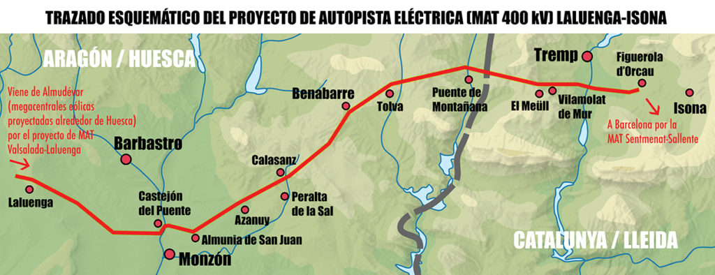La autopista eléctrica afecta a las poblaciones Azanuy -Alins, Peralta de la Sal y Calasanz en La Litera, recorre 11 kilómetros entre Purroy de la Solana, y el polígono de Benabarre, en Viacamp-Literá, la línea sería demoledor para su proyecto turístico. “Los cables van por encima de la Oficina de Turismo. Acabaría con un proyecto turístico del Montsec, las pasarelas, Canelles y nos hipotecaría el futuro de un municipio que agoniza con una densidad de 0,5 personas por metro cuadrado”, lamentaba Pociello, el alcalde de Viacamp.