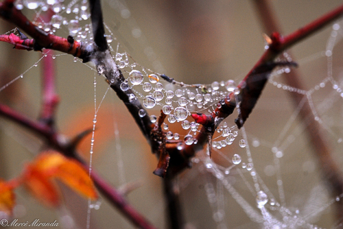 Como siempre mis escritos van acompañados de alguna foto, la de hoy la dedico a valorar las pequeñas maravillas que podemos observar un día cualquiera. Pequeñas gotas de agua un día de niebla… recordando el frio invierno estos días de calor intenso.