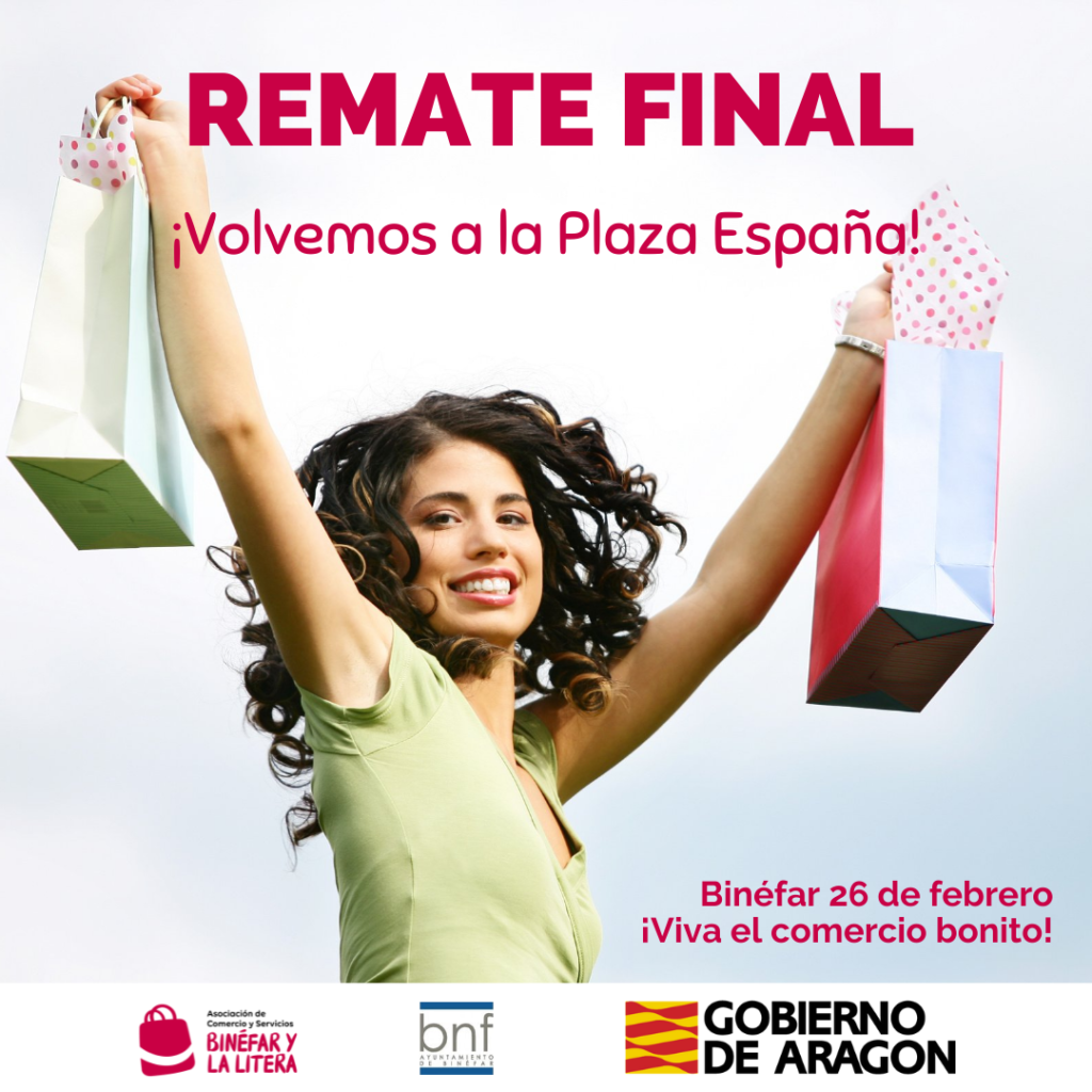 La Asociación de Comercio y Servicios de Binéfar y Litera, en colaboración con el Ayuntamiento de Binéfar y el Gobierno de Aragón organiza la XXXIV edición del Remate Final que tendrá lugar el SÁBADO 26 de febrero, en horario de 9 a 14 horas.